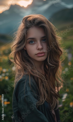 A young woman with long brown hair looks at the camera with a soft expression. AI.