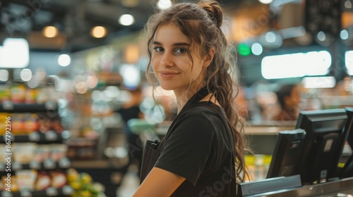 young, woman, female, cashier, supermarket, grocery, store, working, counter, filed, smile, happy, tied-up, client, service, checkout, retail, employee, business, shopping, food, product, aisle, shelf, cash, payment, transaction, men at work, line, industry, uniform, job, clerk, desk