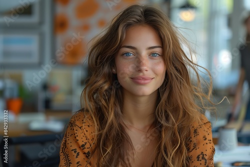 woman, female, office, sitting, desk, chair, long hair, wavy hair, smile, happy, professional, business, work, modern, interior, background, light, natural, casual attire, clothing, orange, brown, white, blue, eye, face, portrait, head shot, young adult