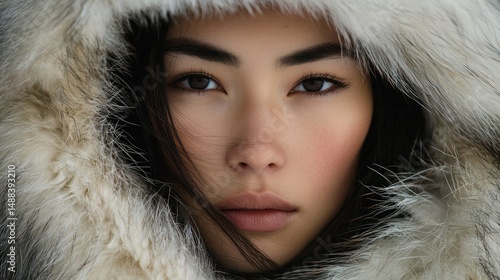 A young woman with long dark hair, wearing a fur-lined hood, looking directly at the camera with a serious expression.