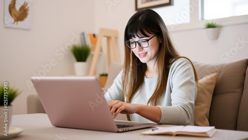 woman, laptop, home, work, education, smile, casual attire, interior, technology, workspace, young, beautiful, comfortable, stylish, decor, indoor, plant, furniture, focused, creative, modern, working, writing, girl, happy, study, relaxed, living room, feminine, lifestyle, computer, cyberspace, web log, screen, digital, task, concentration, remote, productivity, ambience