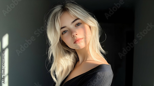 woman, young, female, blond, platinum, hair, portrait, studio, light, shadow, sunlight, posing, attractive, beauty, fashion, glamour, model, style, coiffure, pretty, face, eye, expression, natural, gorgeous, closeup, detail, profile, shoulder, dress, black, clothing, texture, lighting, art, photo, image, design, photographic, woman, portraiture, elegant