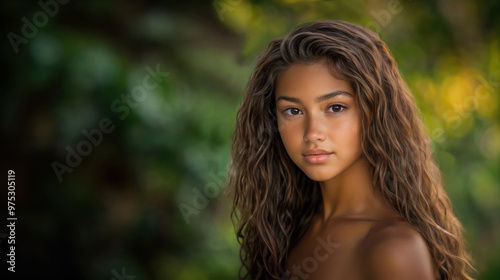 stunning, young, woman, teenage, teenage, wavy, hair, vibrant, blurred, nature, natural, background, soft, gaze, tropical, serene, atmosphere, lifestyle, beauty, outdoors, model, summer, outside, lady