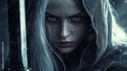 A young woman with white hair and a sword in a hood, with a piercing gaze