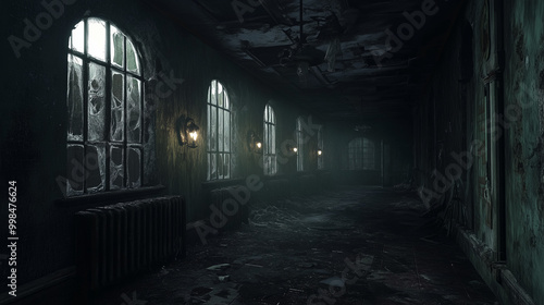 Abandoned Asylum with Broken Windows and Dark Atmosphere