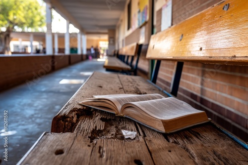 Abandoned Book on School Bench After Class in Empty Hallway Setting