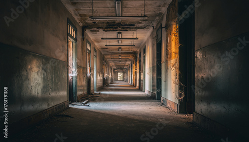 abandoned, hallway, corridor, interior, decay, derelict, old, building, architecture, skittish, dark, grunge, dusty, neglected, empty, creepy, forgotten, vintage, textured, shadow, light, perspective, long, passage, ceiling, light, door, window, wall, floor, debris, spider's web, dust, grime, disused, eerie, haunting, atmosphere, desolation, ruin, disrepair