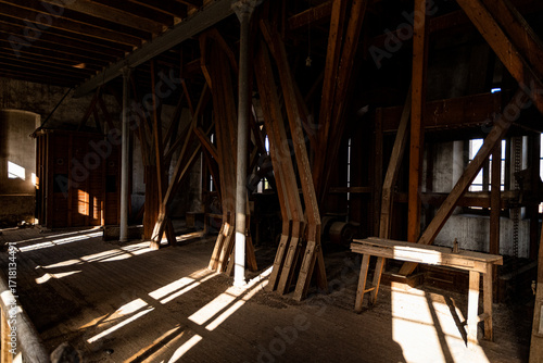 Abandoned industrial space with wooden beams and sunlight streaming through windows