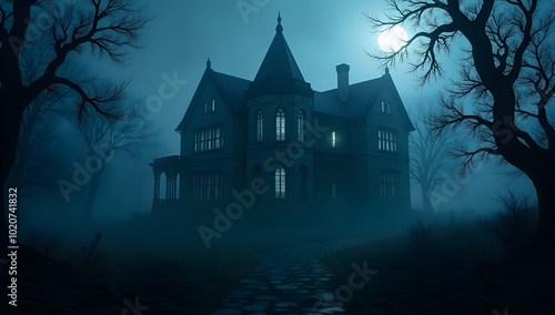 haunted, house, full moon, darkness, eerie, gothic, mystery, shadow, skittish, ghostly, architecture, tree, forest, mist, creepy, lantern, victorian, night, path, chilling, silhouette, fog, luxury home, gable, porch, sinister, twilight, atmosphere, legend, horror, supernatural, whisper, flickering, abandoned, secluded, chill, ominous, spectral, aura