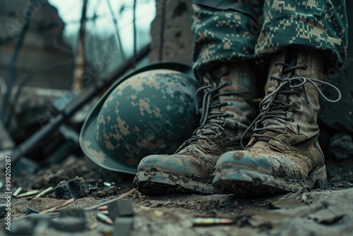 abandoned, army, boot, combat, desert, equipment, fallen, gear, helmet, military, soldier, terrain, uniform