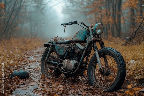 motorcycle, abandoned, bike, vehicle, rust-eaten, rust, leaf, autumn, fall, forest, wood, nature, path, road, dirt, trail, weather, fog, foggy, mist, misty, blue, vintage, old, broken, decay, forgotten, helmet, travel, transportation, outdoors, outside, headlamp, tire, wheel, engine, seat, handlebar, shock, spring, spoke, tree, scenic, landscape, ground, dirty, overgrown, season