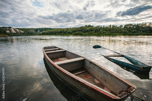 abandoned old wooden fishing boat near pier in summer lake or river. beautiful summer sunny day or evening.