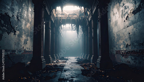 abandoned, passageway, decayed, pillar, row, moss, derelict, asylum, soft, lighting, hanging, hall, dark, room, background, eerie, architecture, skittish, building, scarey, horror, stone, wall, column