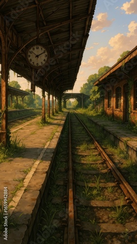 transportation, railroad station, architecture, exploration, train track, historical, abandoned, forgotten, overgrown, wallpaper, ambience, terminal, tranquil, railway, setting, station, vehicle, vintage, mobile, nature, rustic, sunlit, track, anime, clock, place, scene, style, train, urban, rail