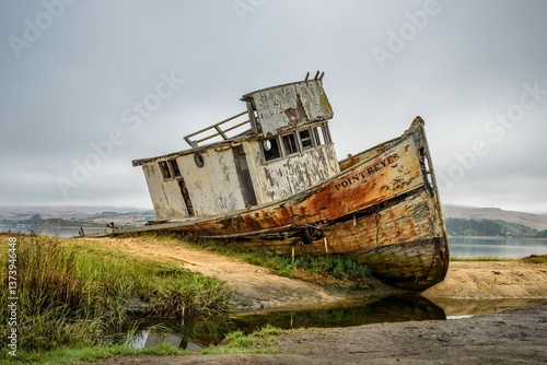 Abandoned shipwreck named Point Reyes on a grassy shore under a cloudy sky in Inverness, California