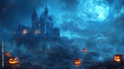 Abandoned spooky castle on a hill, surrounded by fog and glowing pumpkins, under a full moon.