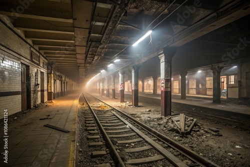 Abandoned subway stations with glowing trails and dusty remnants, luminescent beams, forgotten infrastructure, abandoned station