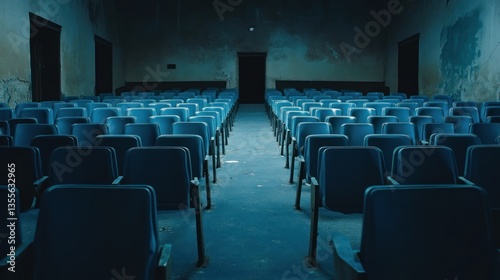 Abandoned Theater: Rows of Empty Blue Seats in a Desolate Hall