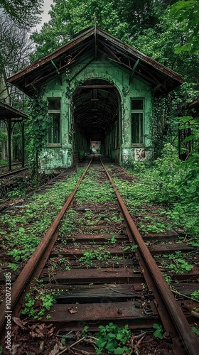 Abandoned train station overgrown with greenery, featuring old tracks and a rustic building that tells a story of time forgotten.