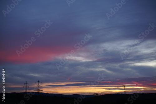 sunset, heaven, cloud, sun, sunrise, countryside, orange, nature, evening, blue, light, yellow, dusk, sunlight, red, silhouette, view, wind, force, magenta, environment