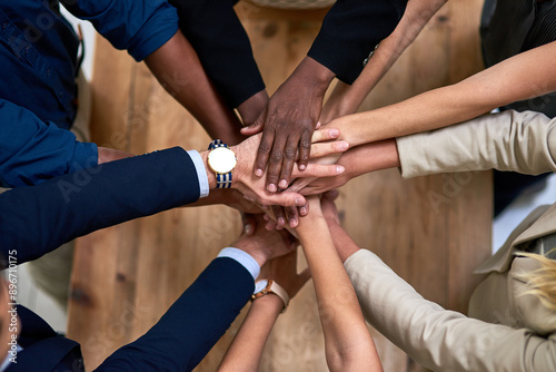 Above, stack or business people with cooperation, hands or professional with mission teamwork. Group, closeup or employees with community support, collaboration or diversity with partnership or trust