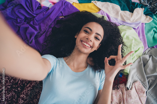Above view photo of nice young girl take selfie show okey symbol messy clutter clothes flat indoors