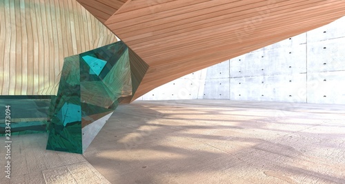 Abstract concrete and wood interior with window. 3D illustration and rendering.