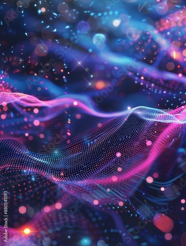 abstract, three-dimensional, glowing, shimmering, wave, bokeh, light, digital, art, motion, dynamic, flow, energy, particle, neon, purple, blue, pink, dark, background, texture, pattern, geometric, design, graphic, modern, futuristic, vibrant, colours, fantasy, science, technology, cosmos, space, mystical, surreal, artistic, illustration, visual