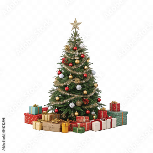 Abstract 3d Christmas tree with beautiful ornaments and many gift box isolated on white background