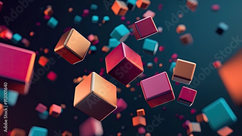 Abstract 3D geometric blocks floating on a dark backdrop. Futuristic design.
