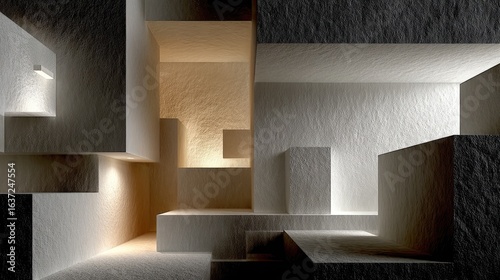 three-dimensional, illusion, paper, cut, minimal, layout, geometric, shape, abstract, architecture, design, texture, light, shadow, beige, white, grey, brown, cubism, modern, contemporary, art, background, graphic, illustration, wallpaper, pattern, artwork, digital, rendering