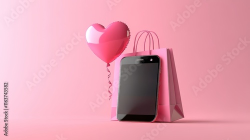 Abstract 3D model of a smartphone with exploding icons of shopping,discounts and digital payment solutions, pastel theme,valentine day,shopping online,aniversary couple,romantic heart love concept.