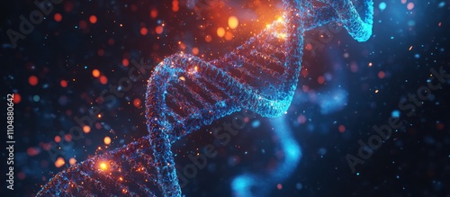 Abstract 3D rendering of a glowing DNA double helix with orange and blue particles in a dark background.