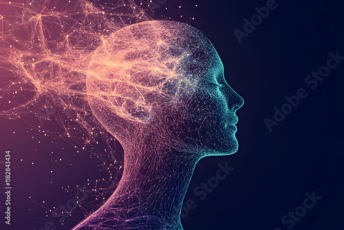 abstract, three-dimensional, wireframe, head, glowing, particle, emanating, half face, dark background, digital artwork, technology, science, futuristic, innovation, network, connection, communication, datum, energy, artificial intelligence, human head, profile, silhouette, light, design, creative, modern, illustration, render, computer graphic, abstract background, gradient, mesh, polygonal, plexus, wire mesh, bright, colourful, vibrant, dynamic, motion, flow, imagination, idea, concept, virtual, cyber