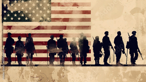 Abstract American flag with American soldiers, Memorial Day, USA, Soldier, US Army, Military, America, Honor, Freedom. Generative AI