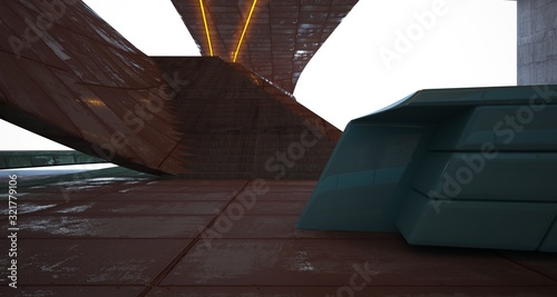 Abstract architectural concrete and rusted metal interior of a minimalist house with colored neon lighting. 3D illustration and rendering.