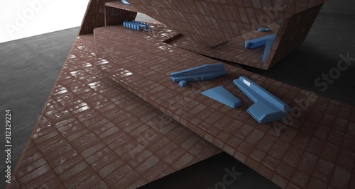 Abstract architectural concrete and rusted metal interior of a minimalist house with swimming pool and large window. 3D illustration and rendering.