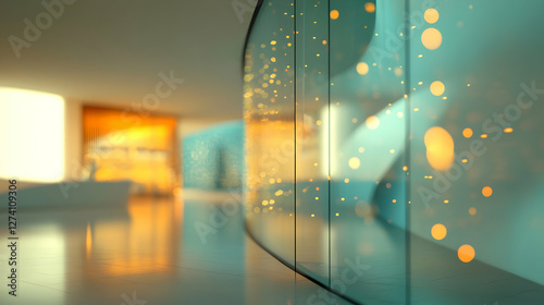 Abstract Architectural Interior with Glowing Orbs and Reflected Light Design Elements