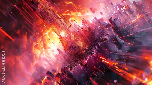 Abstract art featuring a fiery explosion with vibrant red, orange, and purple hues. Dynamic and energetic, the image evokes a sense of power and chaos.