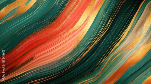 Abstract art featuring swirling emerald, coral, and gold hues. The rich colors and fluid lines create a luxurious and elegant feel.