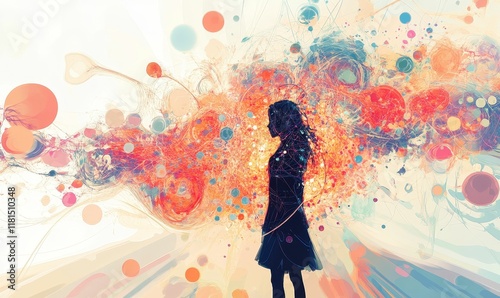 Abstract art; girl silhouette; colorful swirls; vibrant hues.
