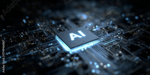 Abstract artificial intelligence concept with glowing circuits and glowing AI symbol representing technology and innovation