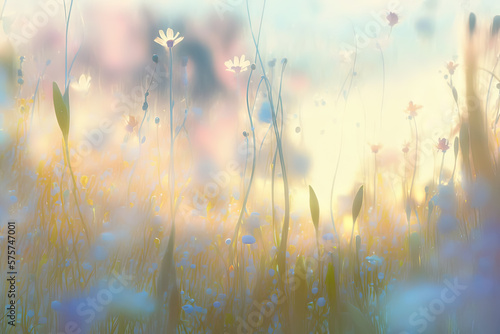 Abstract artistic landscape, field of flowers, soft light colors, sunny day, Generative Ai
