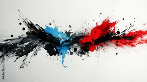 Abstract Artwork Featuring Dynamic Splashes of Red, Blue, and Black Colors on a White Background, Showcasing Movement and Energy in Contemporary Design