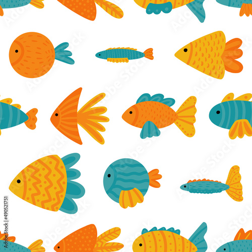 Abstract background with flat sea fish with different designs. Vector hand-drawn seamless pattern.