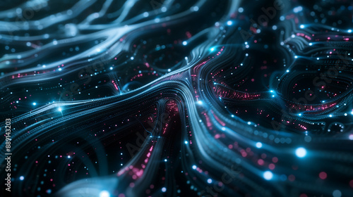 Abstract background with glowing digital waves and data flow concept on dark blue and pink light, technology illustration futuristic style