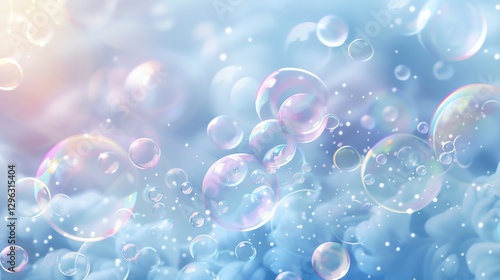 Abstract background with iridescent bubbles floating over blue clouds.