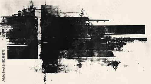 Abstract black and white artwork featuring bold brush strokes and textures, creating dynamic and expressive composition that evokes sense of movement and depth