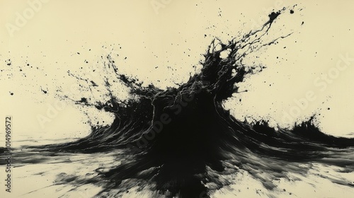 Abstract black and white ink splatter on a canvas, viewed from a slight angle to show the dynamic movement of the splashes
