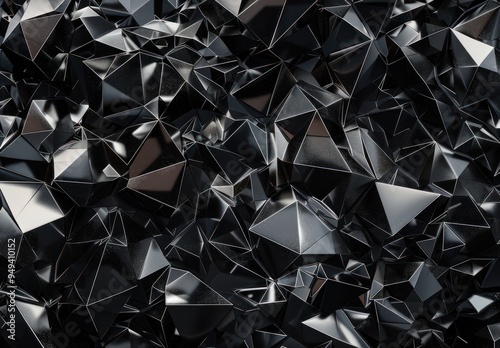 abstract, geometric, pattern, black, shape, triangle, polygon, design, background, texture, digital, art, three-dimensional, render, graphic, illustration, modern, minimal, style, dark, shadow, light, surface, contrast, sharp, edge, line, angle, structure, symmetry, form, composition, futuristic, contemporary, complex, simple, monochromatic, elegance